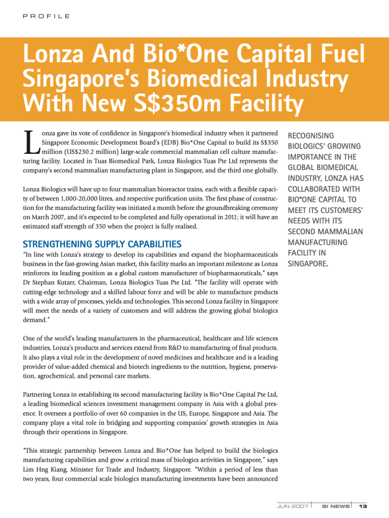 Economic Development Board: Lonza- Click for article